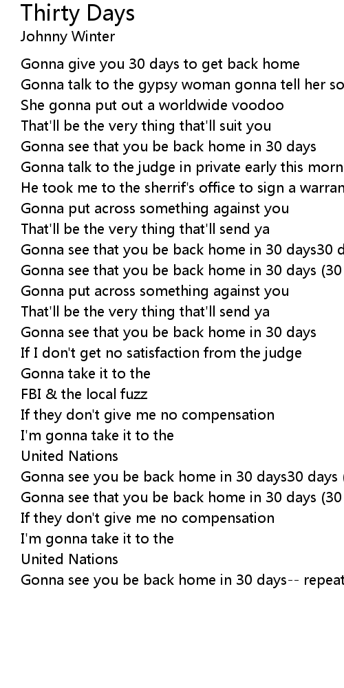 Gonna see that you be back home in 30 days30 days (30 days)30 days (30 days) |