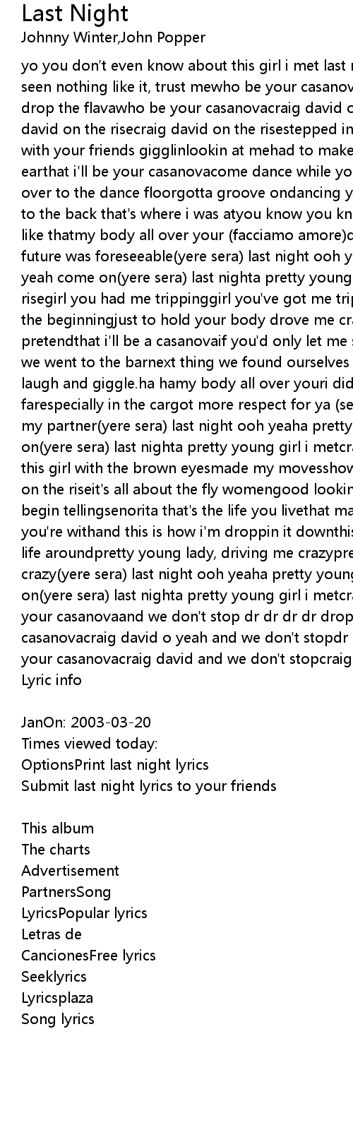 yo you don't even know about this girl i met last nightshe was badyou've never seen nothing like it, trust mewho be your casanovaand we don't stop dr dr dr dr drop the flavawho be your casanovacraig david o yeah and we don't stopcraig david on the risecraig david on the risestepped in the club nowsaw you sitting with your friends gigglinlookin at mehad to make my moveso i whispered in her earthat i'll be your casanovacome dance while you think it overwe made our way over to the dance floorgotta groove ondancing yeah real hard corefrom the front to the back that's where i was atyou know you know south hamptons mans do it like thatmy body all over your (facciamo amore)damn sureshe was irresistablethe future was foreseeable(yere sera) last night ooh yeaha pretty young girl i metoh yeah come on(yere sera) last nighta pretty young girl i metcraig david on the risegirl you had me trippinggirl you've got me trippingmy heart was feenin from the beginningjust to hold your body drove me crazyand it weren't like i had to pretendthat i'll be a casanovaif you'd only let me show yafelt like a drink so we went to the barnext thing we found ourselves in the back of my carmaking laugh and giggle.ha hamy body all over youri didn't want to take it too farespecially in the cargot more respect for ya (senorita)ooh yeah, now you're my partner(yere sera) last night ooh yeaha pretty young girl i metoh yeah come on(yere sera) last nighta pretty young girl i metcraig david on the risei met this girl with the brown eyesmade my movesshowed enterprise that craig david's on the riseit's all about the fly womengood looking womenthose women i can't begin tellingsenorita that's the life you livethat makes you wannaleave the one you're withand this is how i'm droppin it downthis pretty young girl turned my life aroundpretty young lady, driving me crazypretty young lady, driving me crazy(yere sera) last night ooh yeaha pretty young girl i metoh yeah come on(yere sera) last nighta pretty young girl i metcraig david on the risewho be your casanovaand we don't stop dr dr dr dr drop the flavawho be your casanovacraig david o yeah and we don't stopdr dr dr dr drop the flavawho be your casanovacraig david and we don't stopcraig david on the rise |