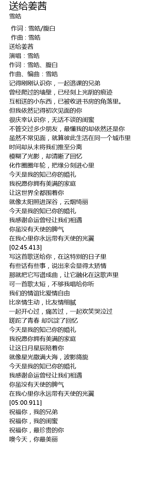 | [02:54.163] | 写这首歌送给你,在这特别的日子里 |