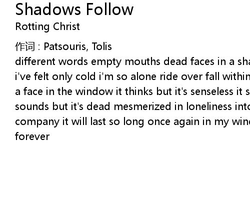 | different words empty mouths dead faces in a shadow world i' ve seen one season i' ve felt only cold i' m so alone ride over fall within shadows follow swallow me a face in the window it thinks but it' s senseless it sees but it' s blind it sounds but it' s dead mesmerized in loneliness into colourful walls my shadow, my company it will last so long once again in my window this winter will last forever |