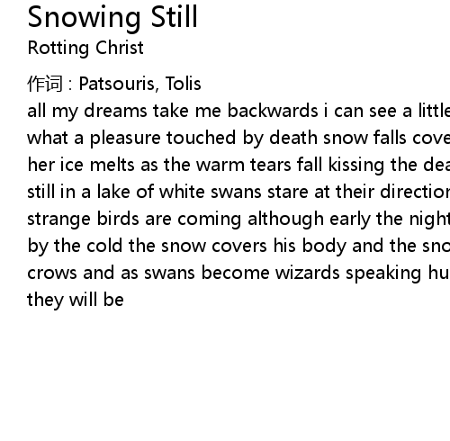 | all my dreams take me backwards i can see a little child his mother in black what a pleasure touched by death snow falls cover the dead cold doesn' t touch her ice melts as the warm tears fall kissing the dead brother and it' s snowing still in a lake of white swans stare at their direction sad they live black strange birds are coming although early the night deep falls tears turn to ice by the cold the snow covers his body and the snow stops falling in shape like crows and as swans become wizards speaking human words the morning next together they will be |