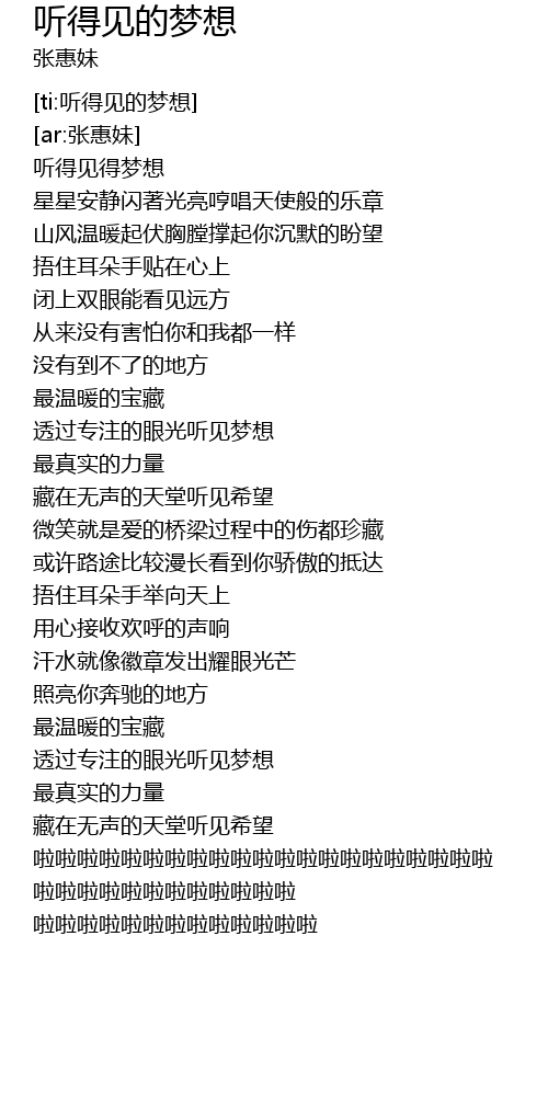 | [00:02.417] | tīng dé jiàn de mèng xiǎng |