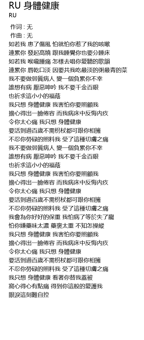 | [01:17.35] | 令你太心痛 我只想 身體健康 |