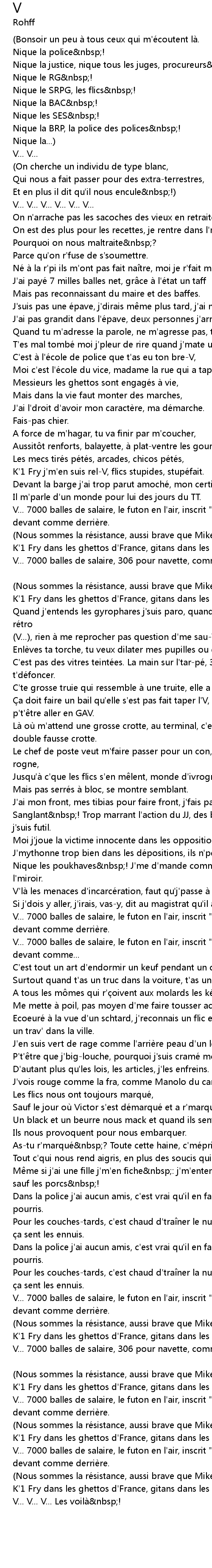 | V... 7000 balles de salaire, le futon en l' air, inscrit " nique la police " devant comme... | |