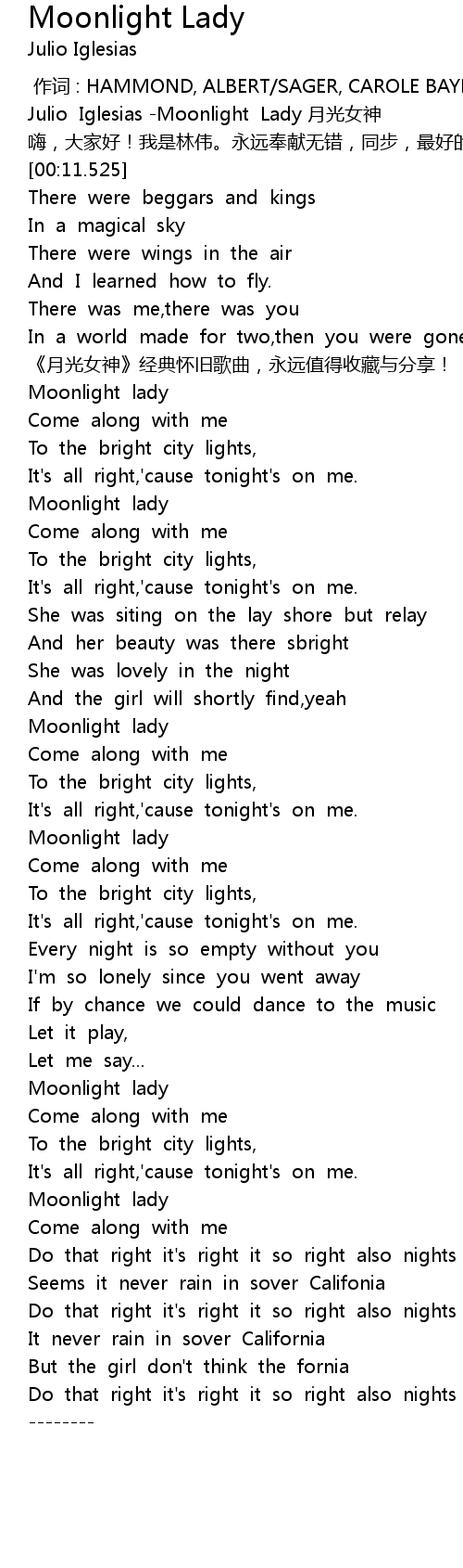 | [00:01.171] | Julio Iglesias -Moonlight Lady 月光女神 |