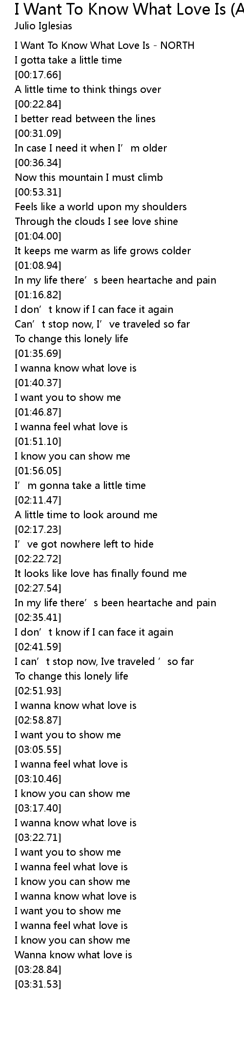 | [00:00.99] | I Want To Know What Love Is NORTH |