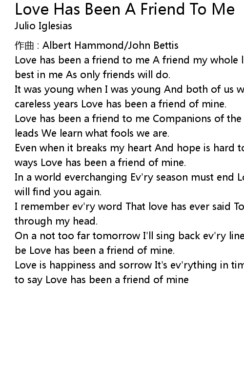 | Love has been a friend to me A friend my whole life through Always saw the | |