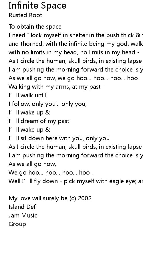 | I need I lock myself in shelter in the bush thick & thorned, in the bush thick and thorned, with the infinite being my god, walking with the great and vast with no limits in my head, no limits in my head - | |