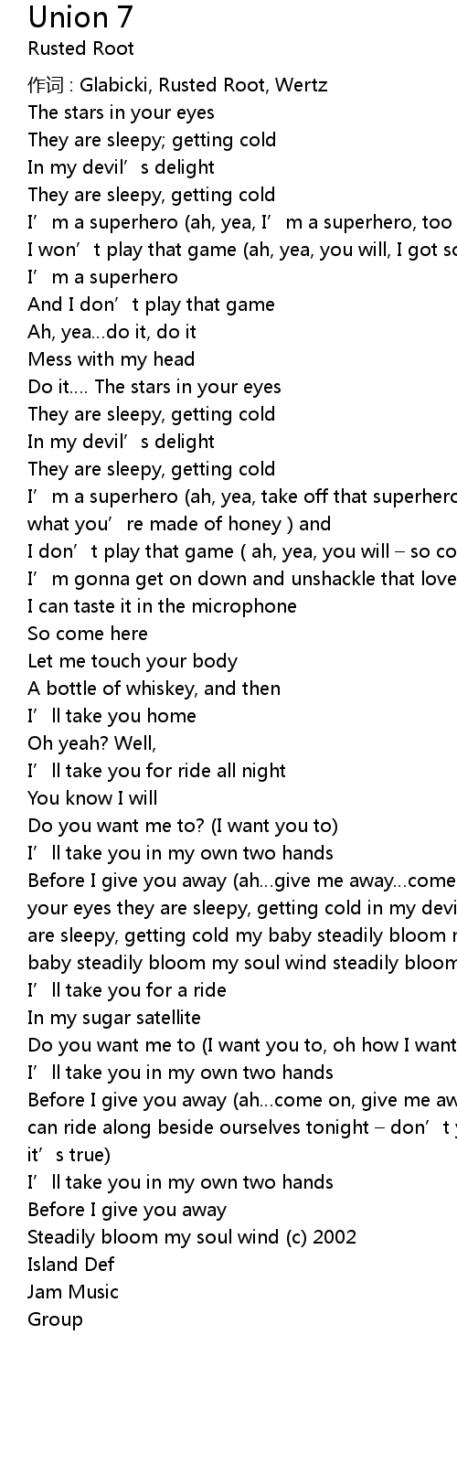 | Before I give you away (ah…give me away…come on and do it ) the stars in your eyes they are sleepy, getting cold in my devil’s , devil’s delight they are sleepy, getting cold my baby steadily bloom my soul wind got to bloom my baby steadily bloom my soul wind steadily bloom my mind | |
