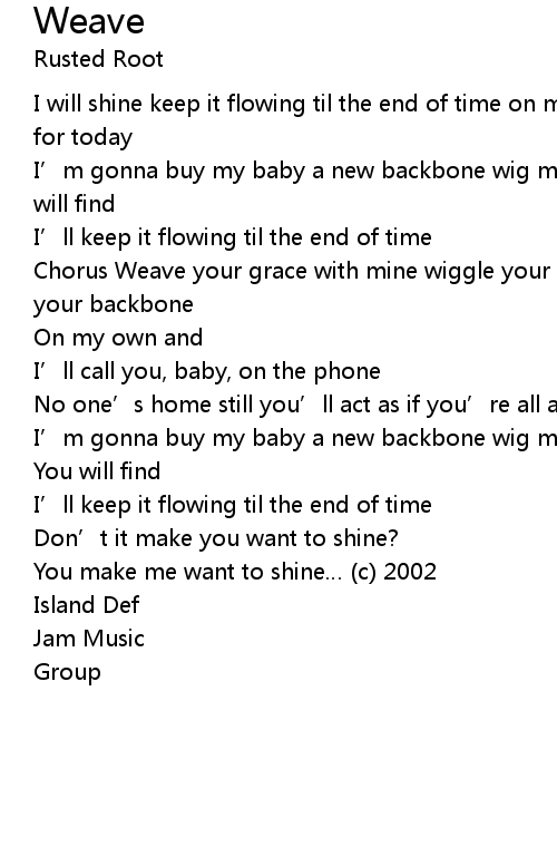 | Chorus Weave your grace with mine wiggle your backbone wig with me, baby wiggle your backbone | |