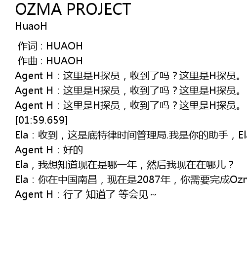 | [00:03.024] | Agent H: zhè lǐ shì H tàn yuán, shōu dào le ma? zhè lǐ shì H tàn yuán. |