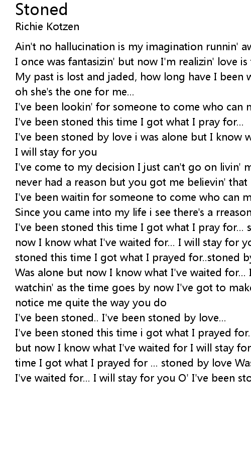 I've been stoned this time i got what I prayed for... stoned by love Wsa alone but now I know what I've waited for I will stay for you I've been stoned this time I got what I prayed for ... stoned by love Was alone but now I know what I've waited for... I will stay for you O' I've been stoned by love... |