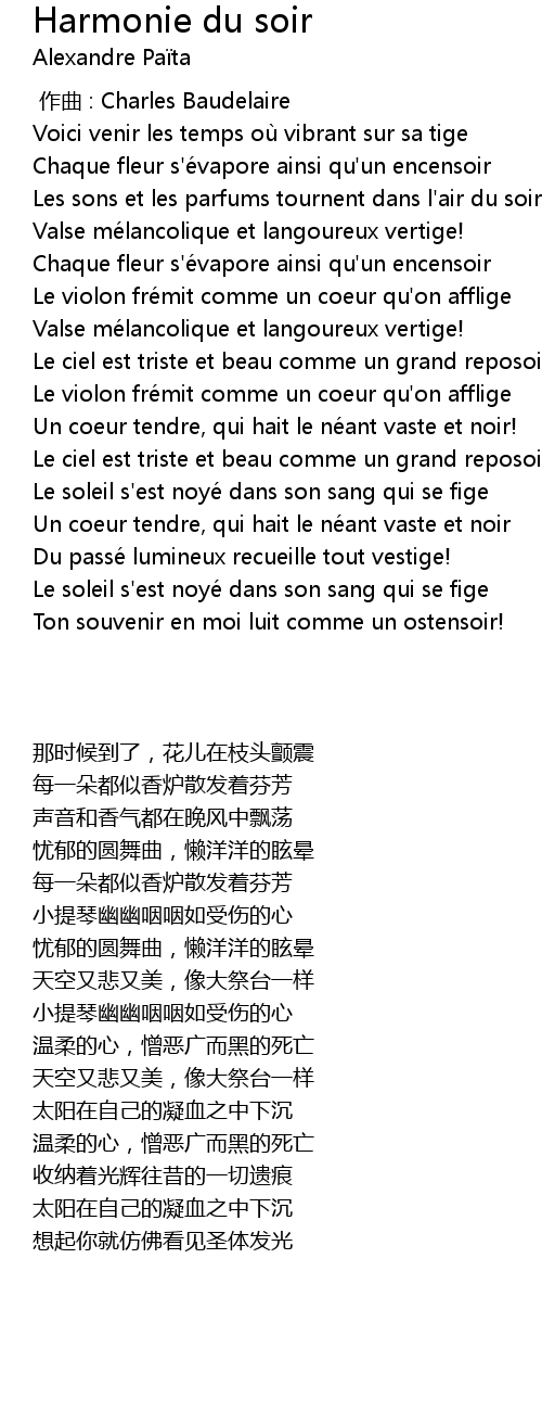 | [00:39.641] | Chaque fleur s'é vapore ainsi qu' un encensoir |