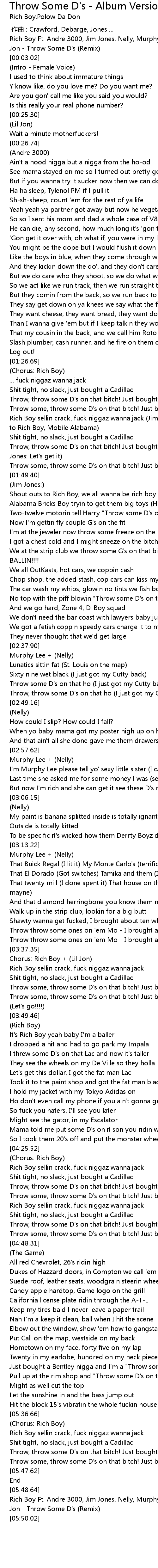 | [00:00.02] | Rich Boy Ft. Andre 3000, Jim Jones, Nelly, Murphy Lee, The Game Lil Jon Throw Some D' s Remix |