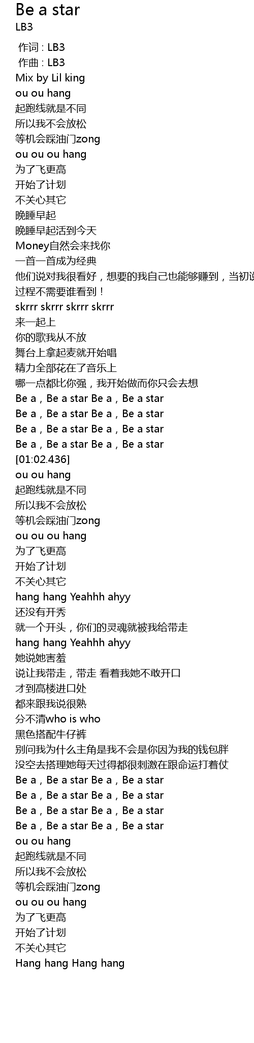 | [01:52.014] | Be a, Be a star Be a, Be a star |