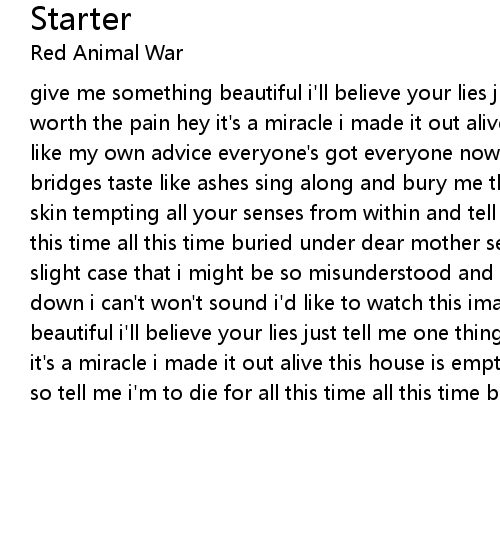 give me something beautiful i'll believe your lies just tell me one thing is it worth the pain hey it's a miracle i made it out alive this house is empty much like my own advice everyone's got everyone now no one's without a theme burning bridges taste like ashes sing along and bury me there's something beneath your skin tempting all your senses from within and tell me where have you been all this time all this time buried under dear mother send me something good in the slight case that i might be so misunderstood and still you throw your pennies down i can't won't sound i'd like to watch this image burn give me something beautiful i'll believe your lies just tell me one thing is it worth the pain hey it's a miracle i made it out alive this house is empty much like my own advice so tell me i'm to die for all this time all this time buried under |