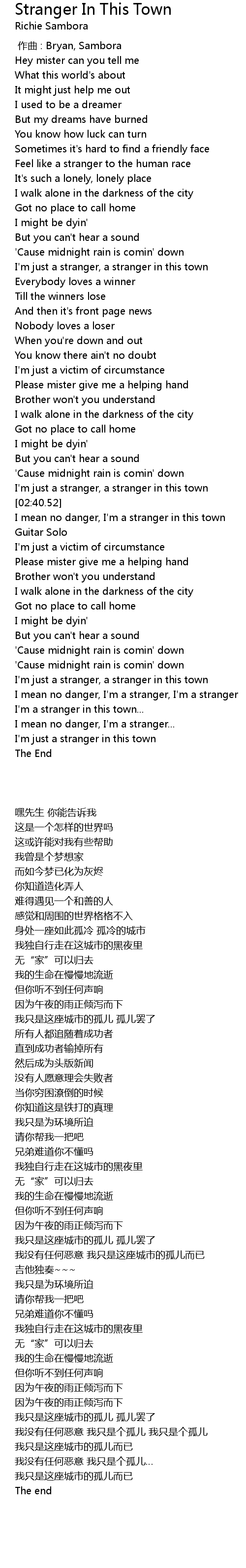 | [02:33.53] | I' m just a stranger, a stranger in this town |