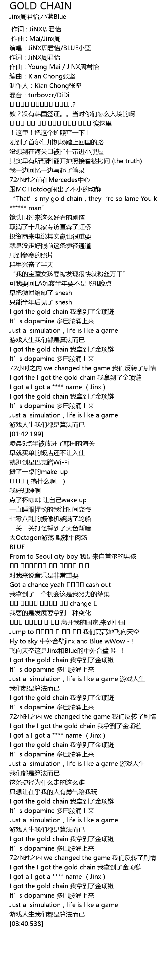 | [03:19.786] | I got the gold chain wǒ ná dào le jīn xiàng liàn |