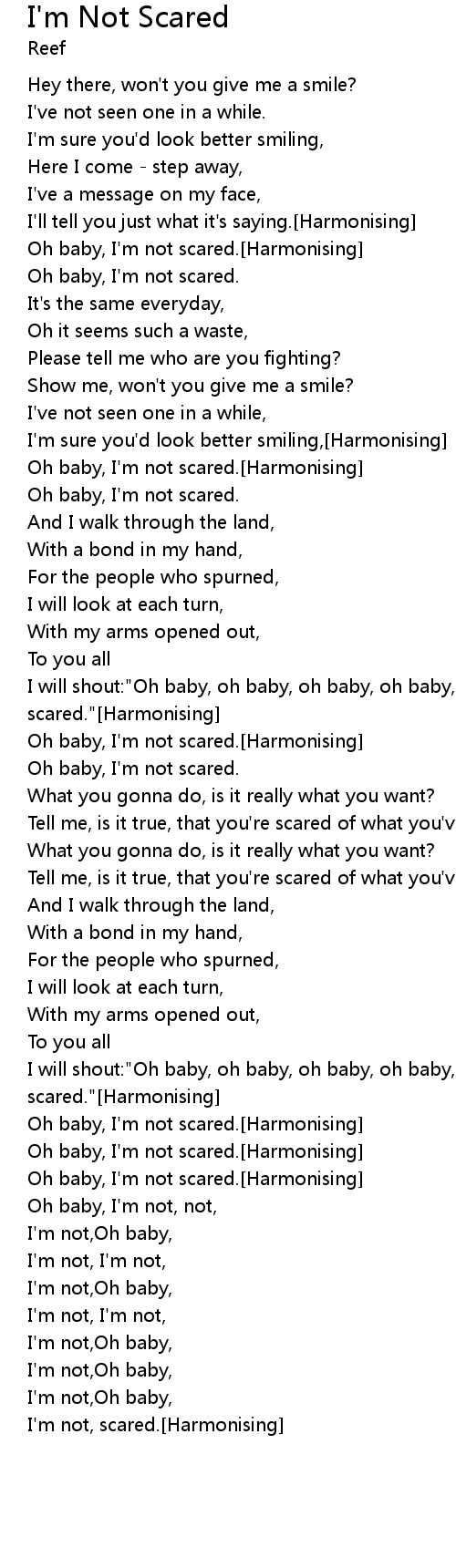 | I will shout:"Oh baby, oh baby, oh baby, oh baby, oh baby I'm not scared."[Harmonising] | |