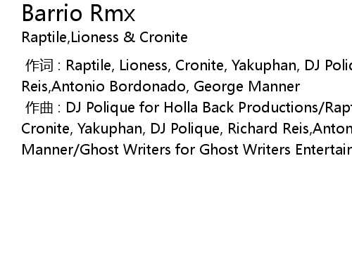 | [00:00.000] | zuo qu : DJ Polique for Holla Back Productions Raptile, Lioness, Cronite, Yakuphan, DJ Polique, Richard Reis, Antonio Bordonado, George Manner Ghost Writers for Ghost Writers Entertainment |
