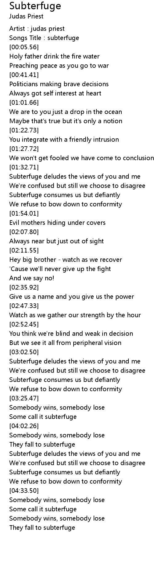 | [04:13.12] | Subterfuge deludes the views of you and me |