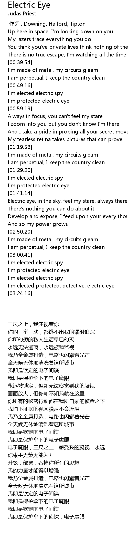| [02:30.81] | Electric eye, in the sky, feel my stare, always there |