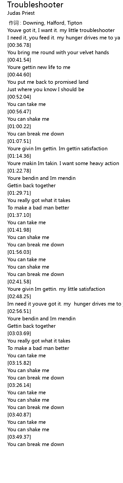 | [00:23.83] | Youve got it, I want it. my little troubleshooter |