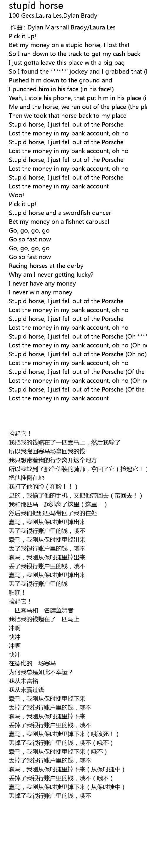 | [01:37.00] | Stupid horse, I just fell out of the Porsche Oh |