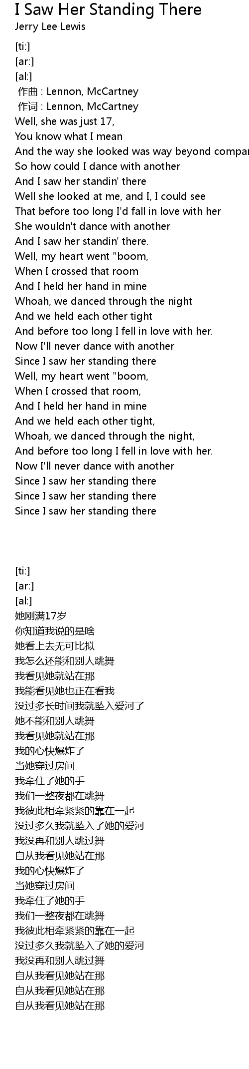 | [00:23.33] | And I saw her standin' there |