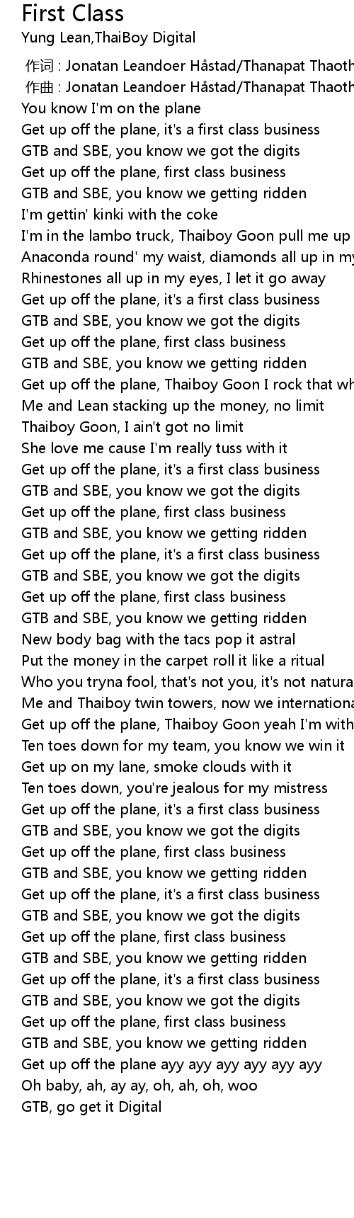 | [00:11.50] | Get up off the plane, it's a first class business |