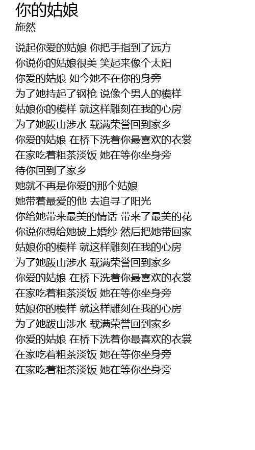 | [02:39.143] | nǐ ài de gū niáng zài qiáo xià xǐ zhe nǐ zuì xǐ huān de yī shang |