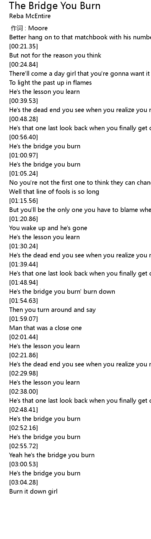 | [01:49.69] | He' s the bridge you burn' burn down |