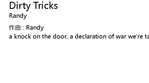 | a knock on the door, a declaration of war we' re taking over to the sound of guitars wrong is made right, tables are turned cause i' m here to teach and they' ve got to learn burning tires, building bombs, throwing bricks so it goes when the kids are sick of your dirty tricks power in the hands of those rich enough to buy it we' re taking it back with this musical riot politicians, police and the laws kicking them out with our rocking armed force burning tires, building bombs, throwing bricks so it goes when the kids are sick of your dirty tricks hope i' m dead before i' m old things aren' t going very well honey, you and me are being bought and sold i knew i was in trouble, didn' t know i was in hell burning tires, building bombs, throwing bricks so it goes when the kids are sick of your dirty tricks dirty business, dirty deeds and dirty politics we had enough, the kids are sick of your dirty tricks |