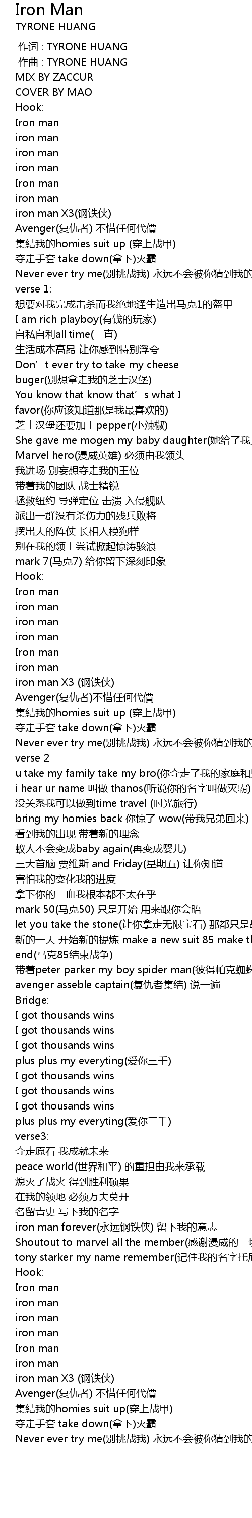 | [02:27.649] | iron man forever yǒng yuǎn gāng tiě xiá liú xià wǒ de yì zhì |