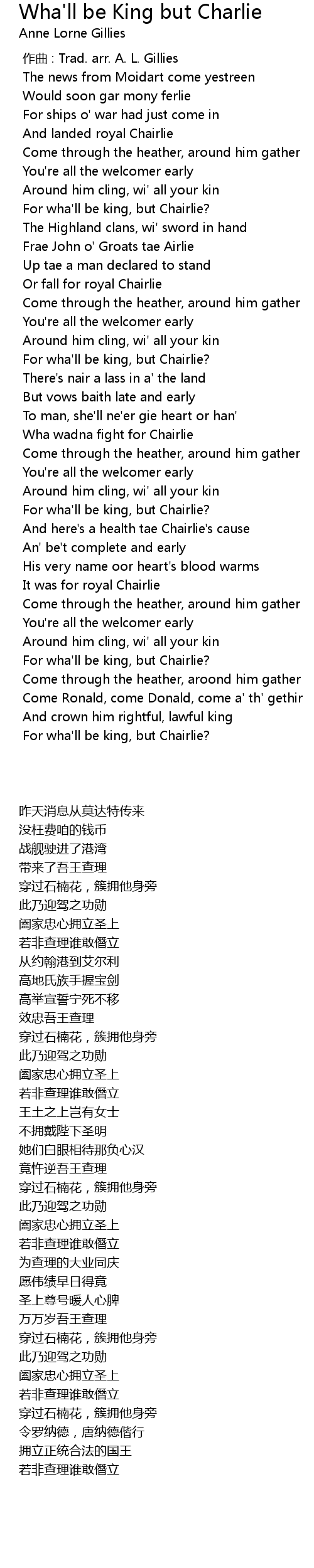 | [00:40.116] | For wha'll be king, but Chairlie? |