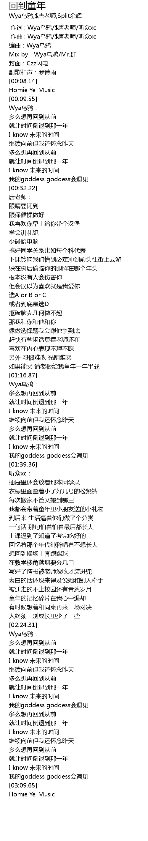 | [00:00.000] | 作词 : Wya乌鸦/$唐老师/听众xc |