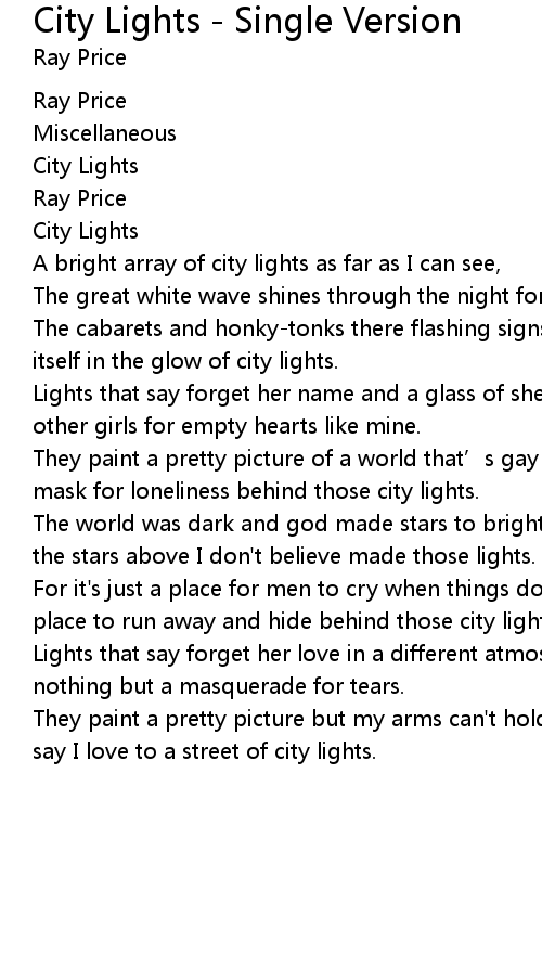 | The cabarets and honkytonks there flashing signs invite A broken heart to lose itself in the glow of city lights. | |