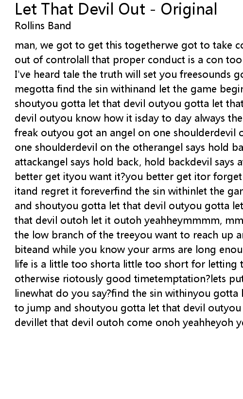 I've heard tale the truth will set you freesounds good to mesounds good to megotta find the sin withinand let the game beginif you want to jump and shoutyou gotta let that devil outyou gotta let that devillet that devillet that devil outyou know how it isday to day always the sameday in, day out, same ol' freak outyou got an angel on one shoulderdevil on the otheryou got an angel on one shoulderdevil on the otherangel says hold back, hold backdevil says attack, attackangel says hold back, hold backdevil says attack, attackyou want it?you better get ityou want it?you better get itor forget itand regret itor forget itand regret it foreverfind the sin withinlet the game beginif you want to jump and shoutyou gotta let that devil outyou gotta let that devillet that devillet that devil outoh let it outoh yeahheymmmm, mmmm, mmmmyepso many ripe apples on the low branch of the treeyou want to reach up and pull one down and take a biteand while you know your arms are long enoughthey feel a little too shortlike life is a little too shorta little too short for letting temptation ruinan otherwise riotously good timetemptation?lets put temptation on the unenjoyment linewhat do you say?find the sin withinyou gotta let the game beginif you want to jump and shoutyou gotta let that devil outyou gotta let that devillet that devillet that devil outoh come onoh yeahheyoh yeahalright |