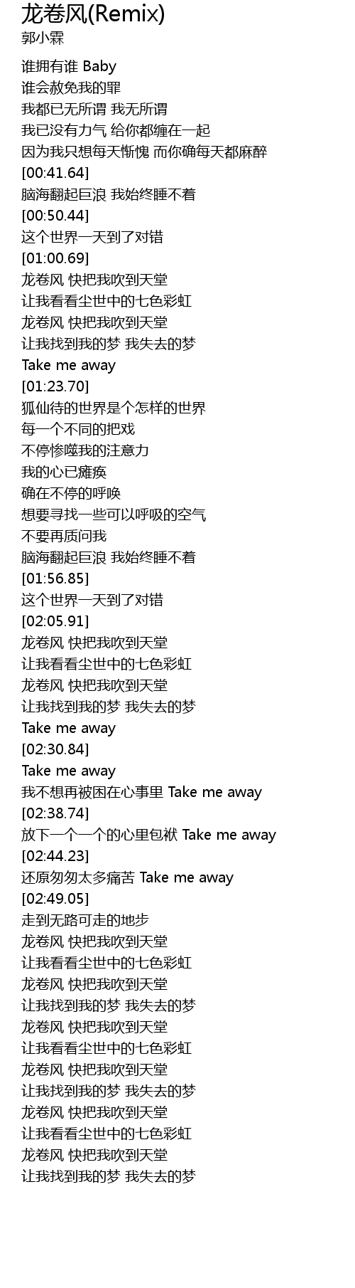 | [03:34.54] | 龙卷风 快把我吹到天堂 |