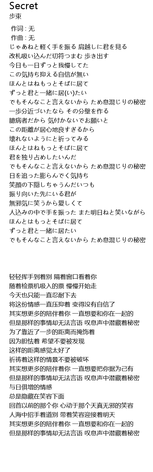 | [02:52.175] | でもそんなこと言えないから ため息混じりの秘密 |