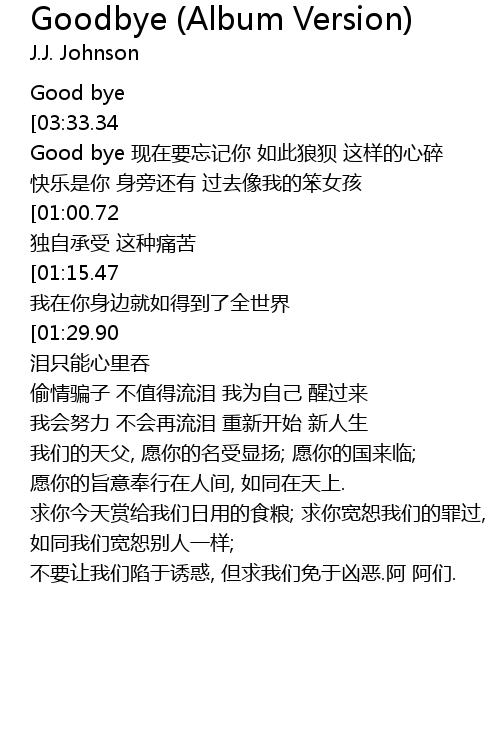 | [03:04.80][01:29.90] | Good bye Good bye 我太傻了 不能埋怨 泪只能心里吞 |