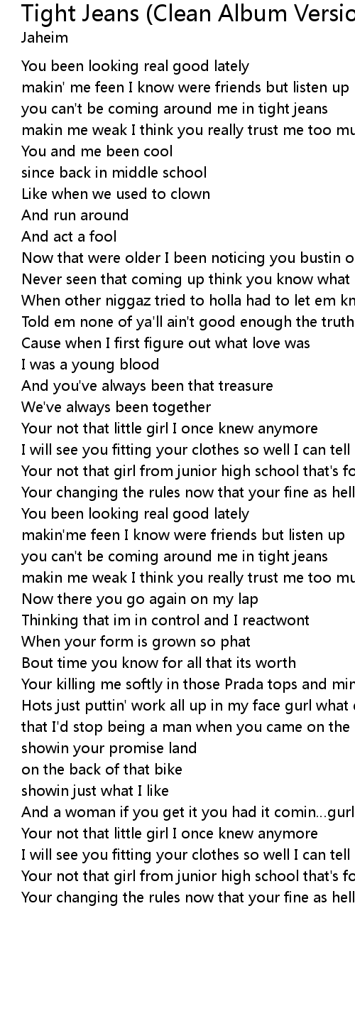 | [00:38.23] | Now that were older I been noticing you bustin out those jeans |