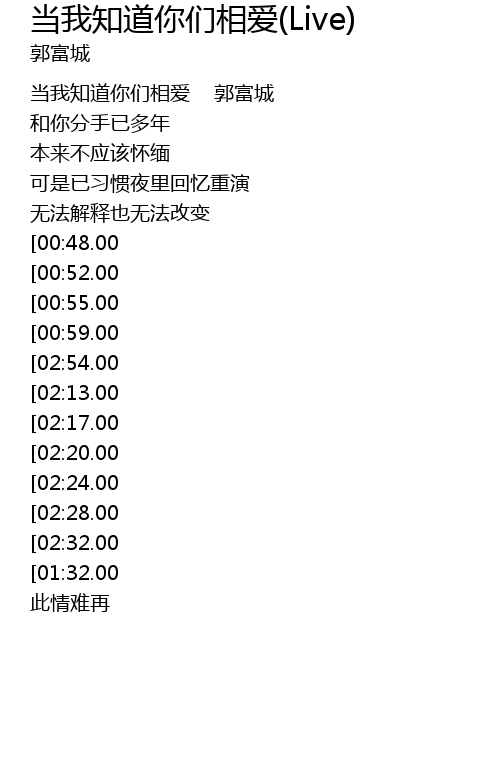 | [03:38.00][02:54.00][02:09.00][01:06.00] | 当我知道你们相爱 |