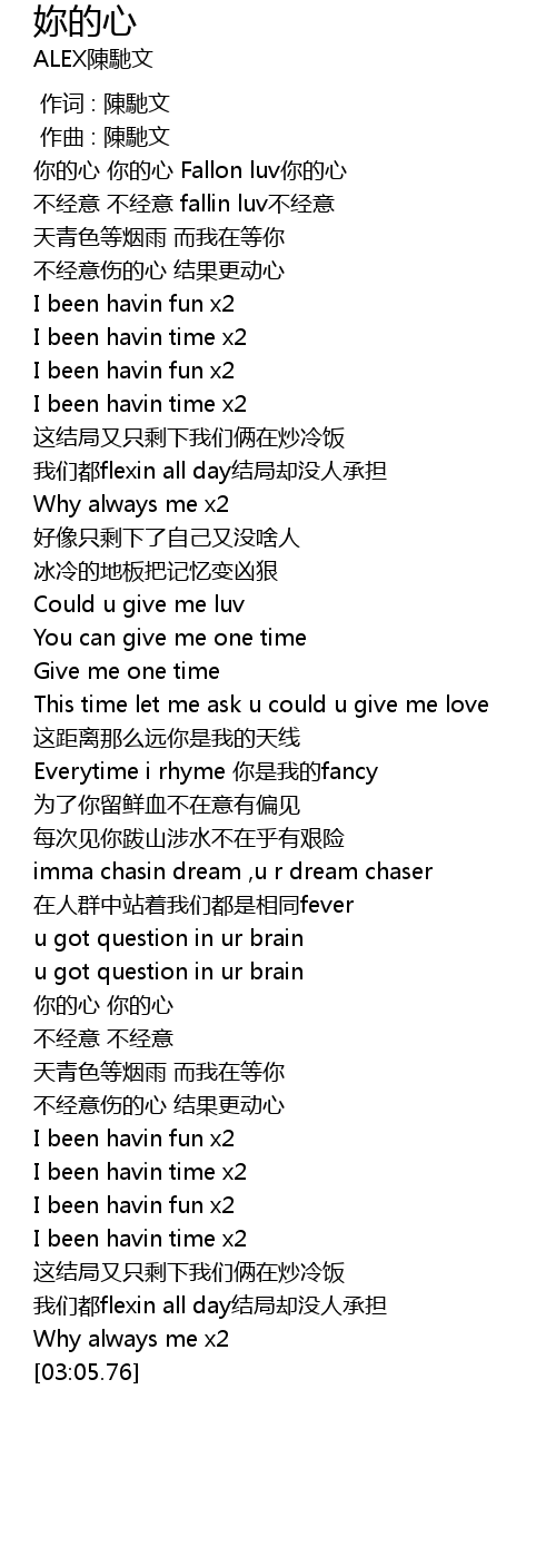 | [00:20.46] | nǐ de xīn nǐ de xīn Fallon luv nǐ de xīn |