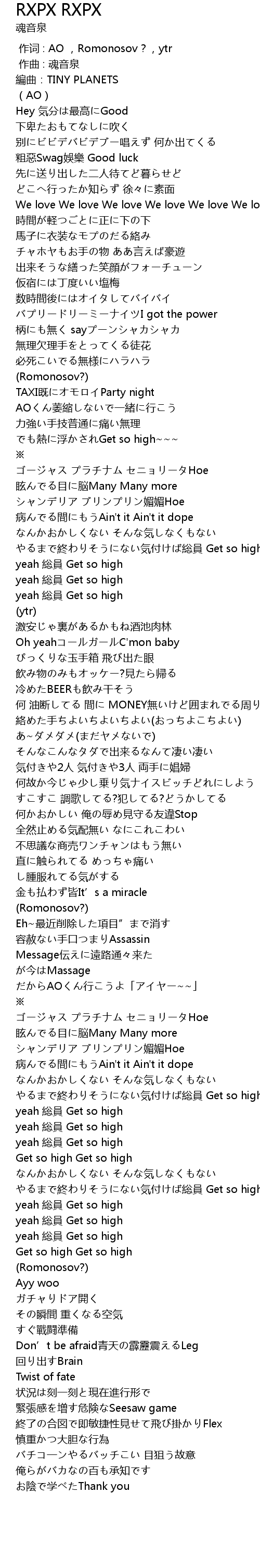 | [02:52.13] | やるまで終わりそうにない気付けば総員 Get so high |