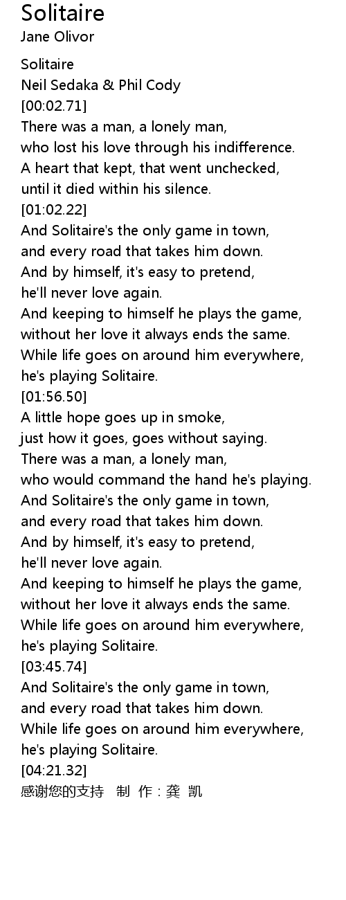| [01:03.62] | And Solitaire' s the only game in town, |