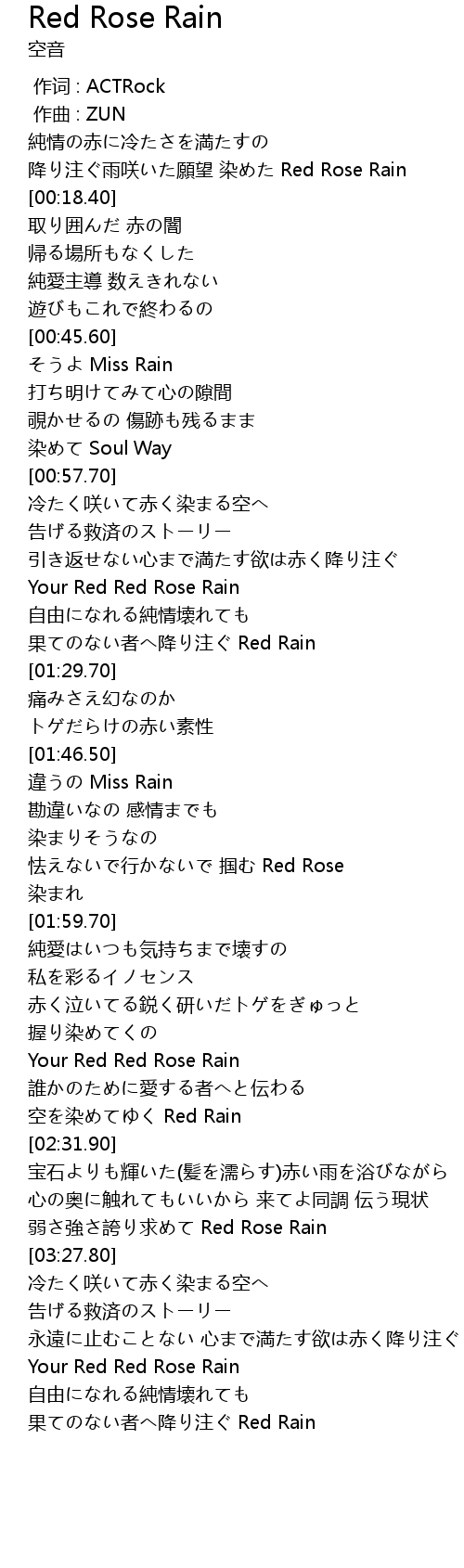 | [00:10.50] | 降り注ぐ雨咲いた願望 染めた Red Rose Rain |