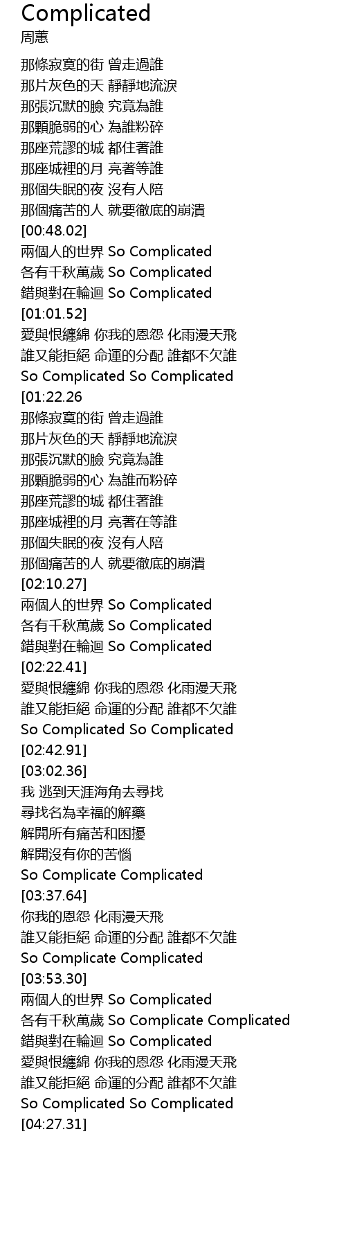 | [00:48.36] | liǎng gè rén de shì jiè So Complicated |