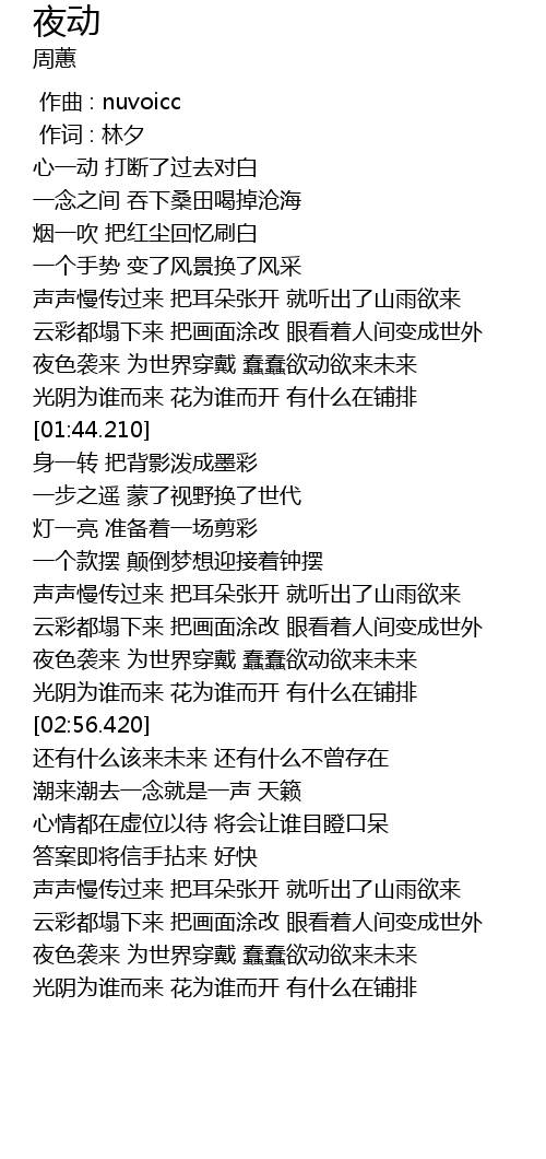 | [02:38.830] | 夜色袭来 为世界穿戴 蠢蠢欲动欲来未来 |