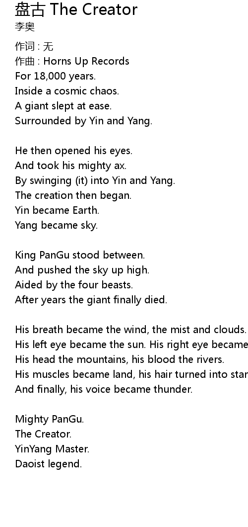 | Song | 盘古 The Creator |